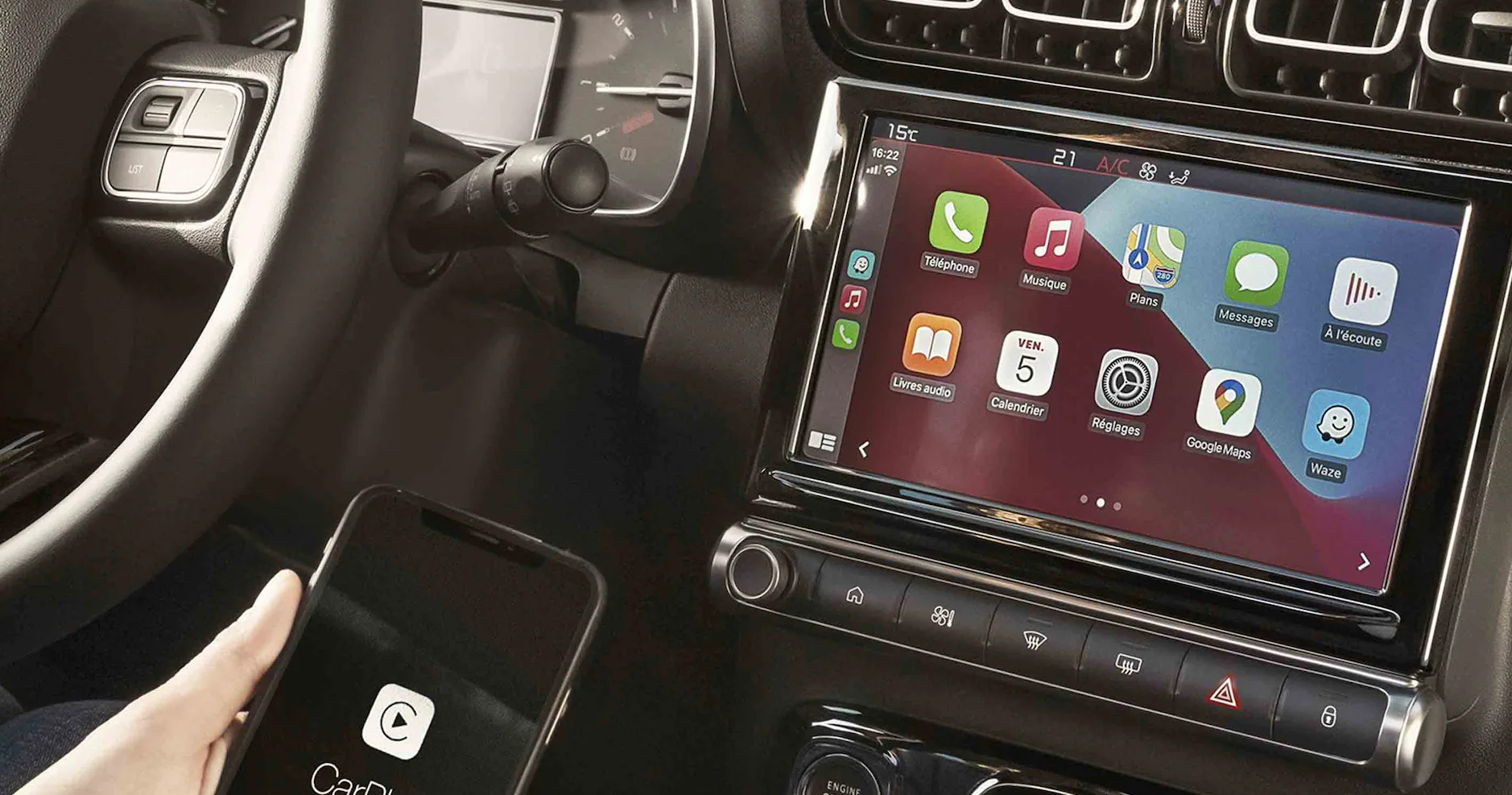 Tiene conectividad con apple car play y Android pero con cable. Cuenta también con un cargador inalámbrico para los smartphones en una bandeja bajo el ordenador central de abordo.