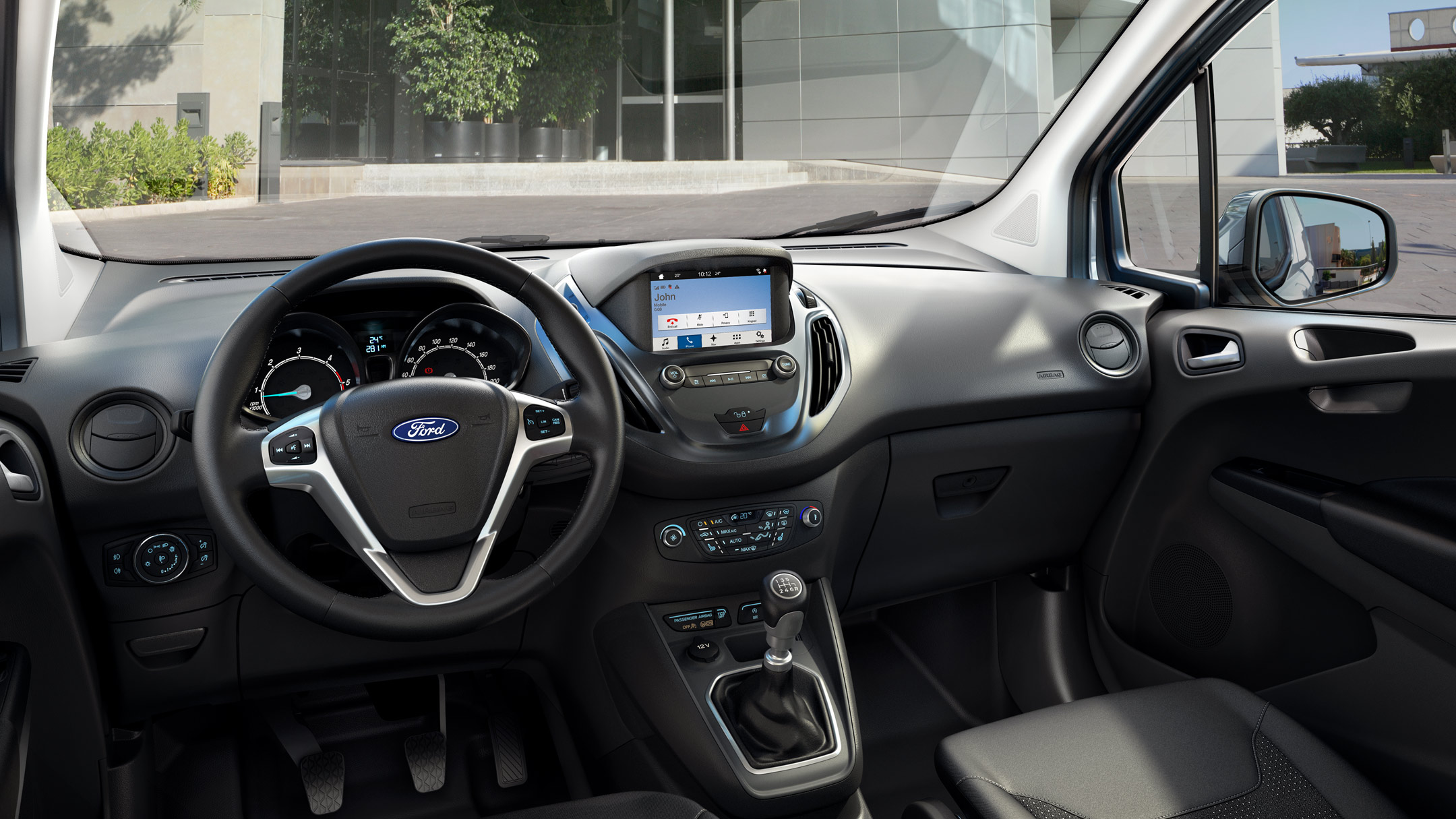 Otro de los puntos fuertes del Ford Transit Courier Van es que cuenta con lo último en tecnología para facilitarte el trabajo. Como la cámara de visión trasera que se activa automáticamente cuando pones marcha atrás y te muestra líneas virtuales para ayudarte a aparcar en los espacios más reducidos.